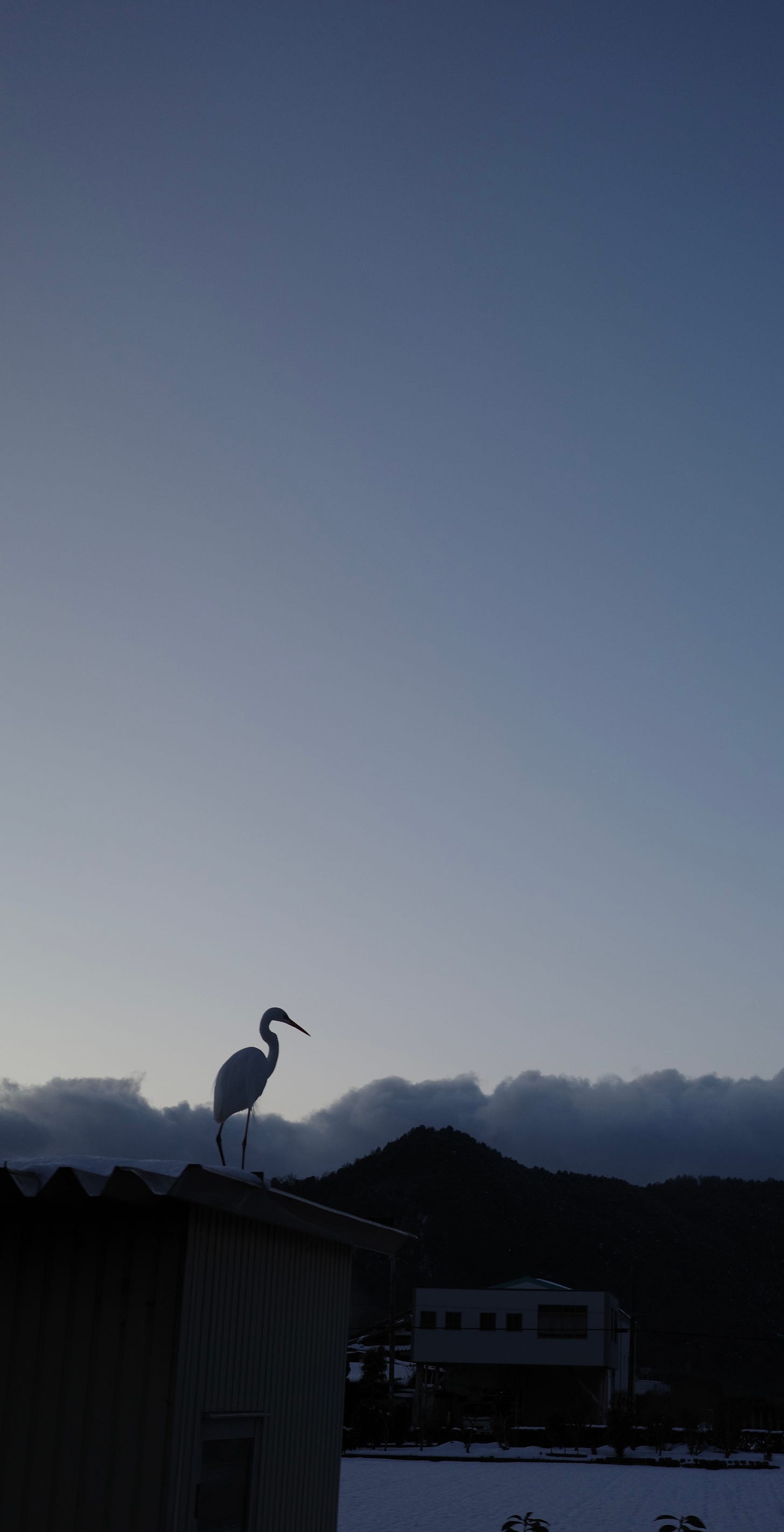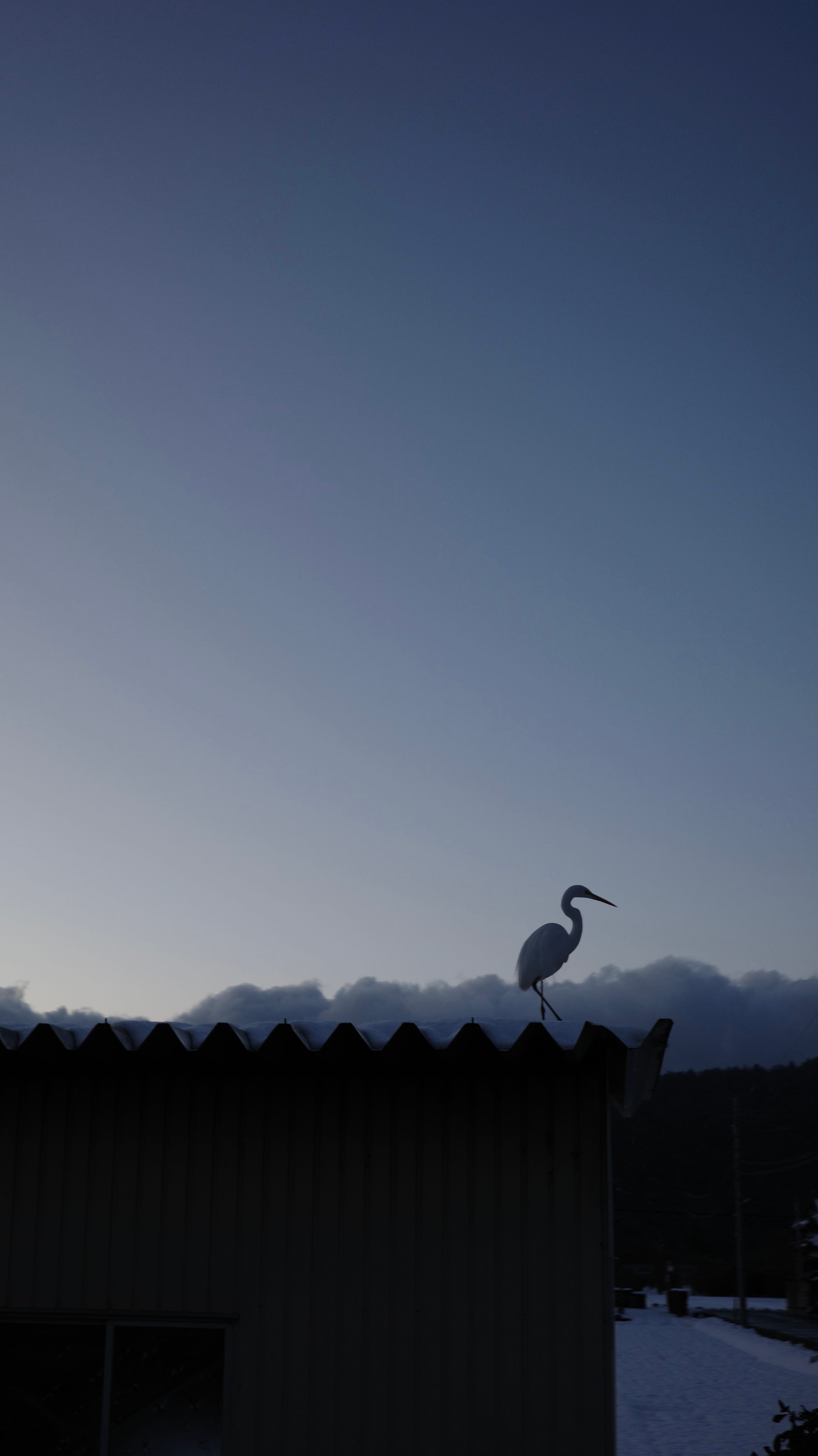 The heron crept to the edge of the roof. He crossed his thin legs and gazed at the vast frozen land, as though charting his flight. Only when he had turned his needle-like beak towards the clouds did he beat his wings, taking off towards the fleece-like clouds, smoldering blue in the dusky light.